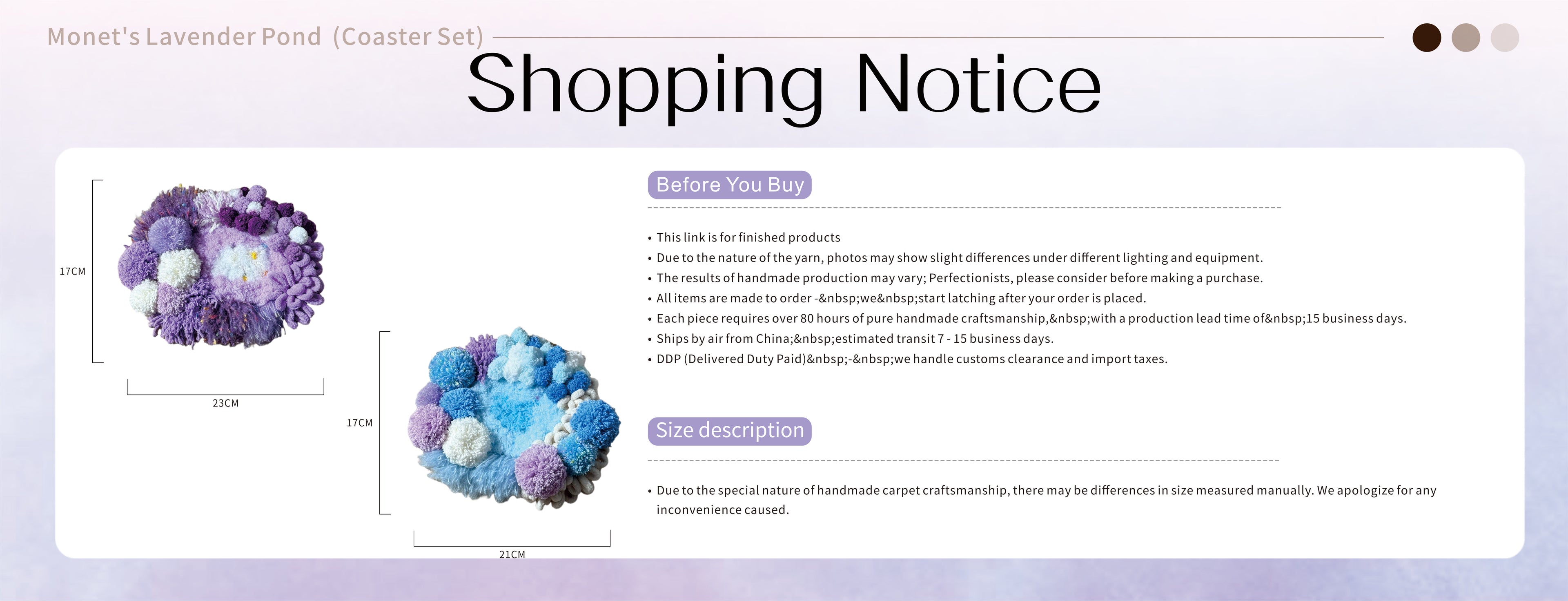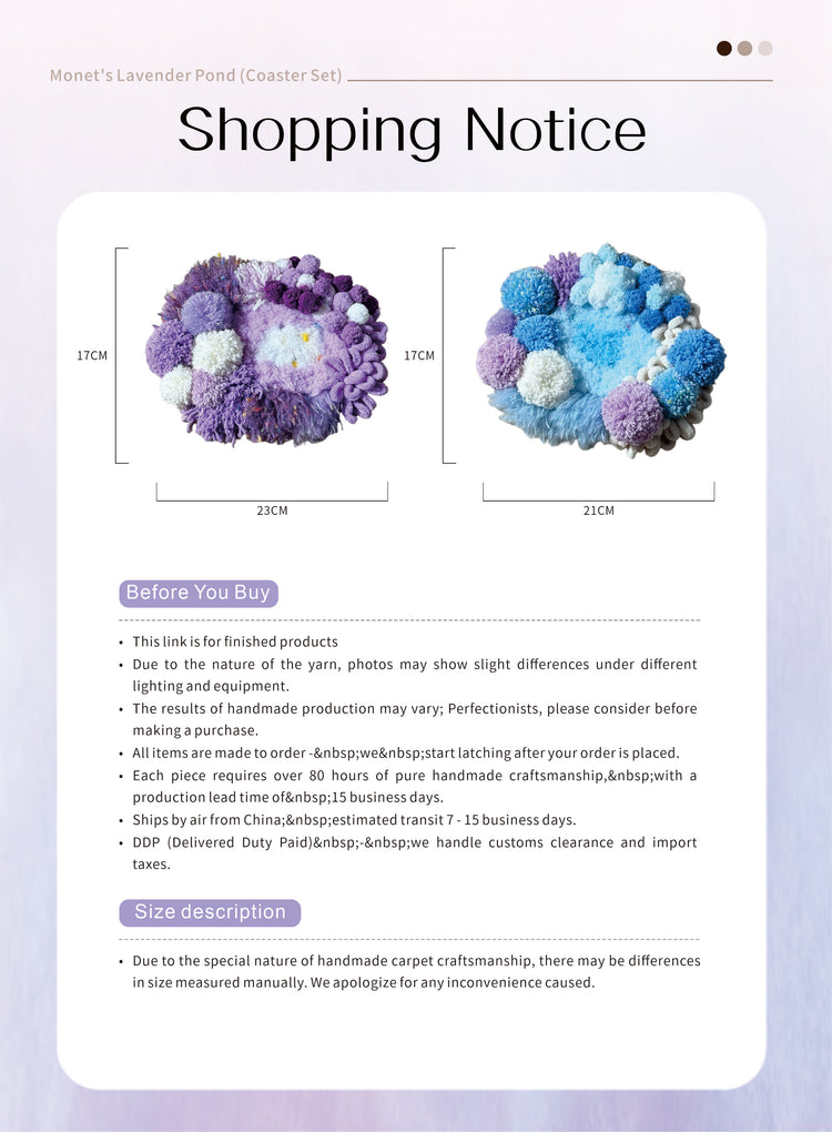 Inspired by the dreamlike serenity of Monet’s water garden, the Monet’s Lavender Pond coaster duo blends gentle lilacs, misty blues, and airy textures into a harmonious, painterly landscape. Each piece feels like a small fragment of an early-morning pond — where colors blur softly into one another, light drifts across the surface, and everything settles into a quiet, poetic calm. This duo brings a touch of impressionist grace to your everyday rituals, inviting you to pause, breathe, and rest in a moment of lavender-tinted peace.