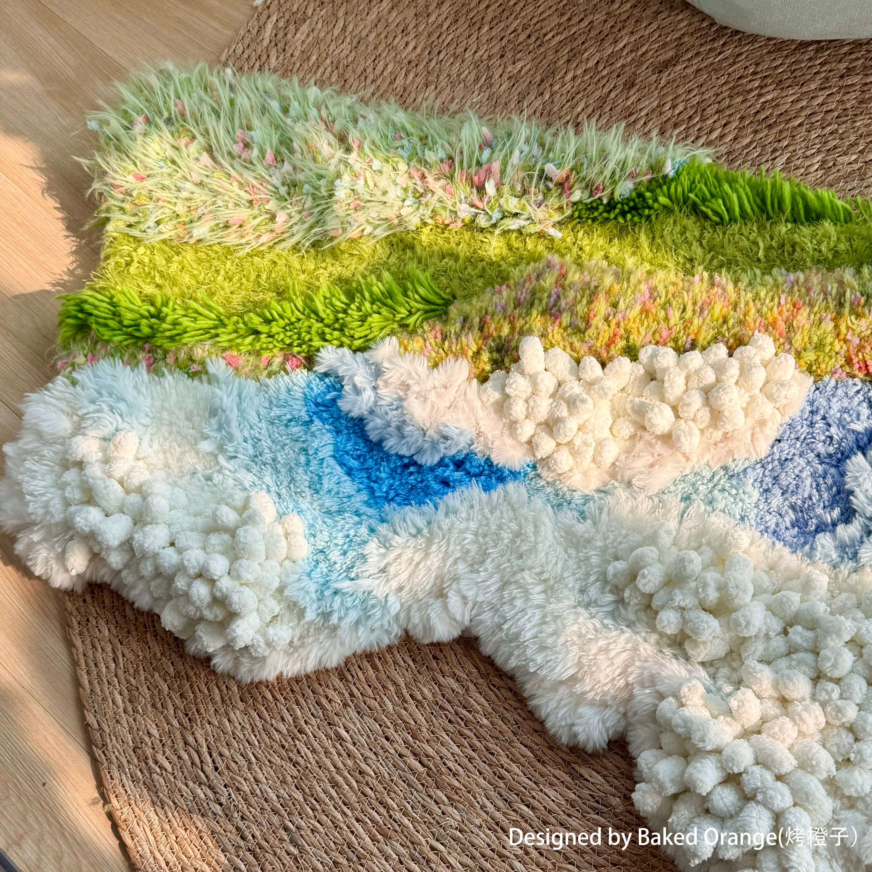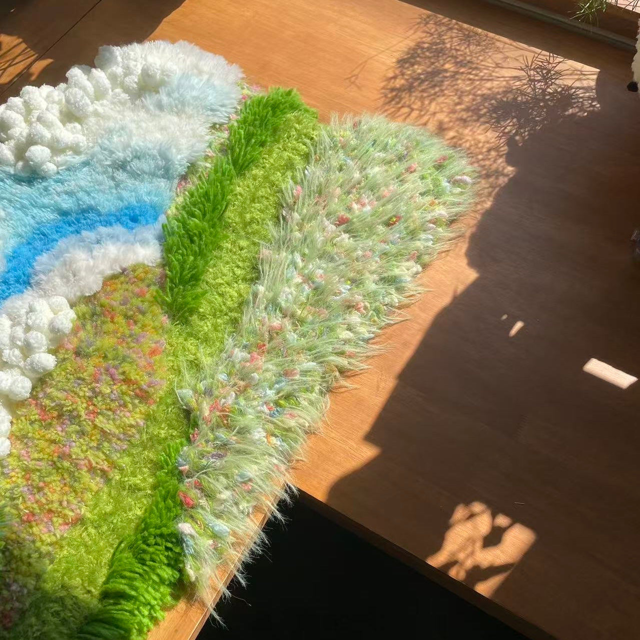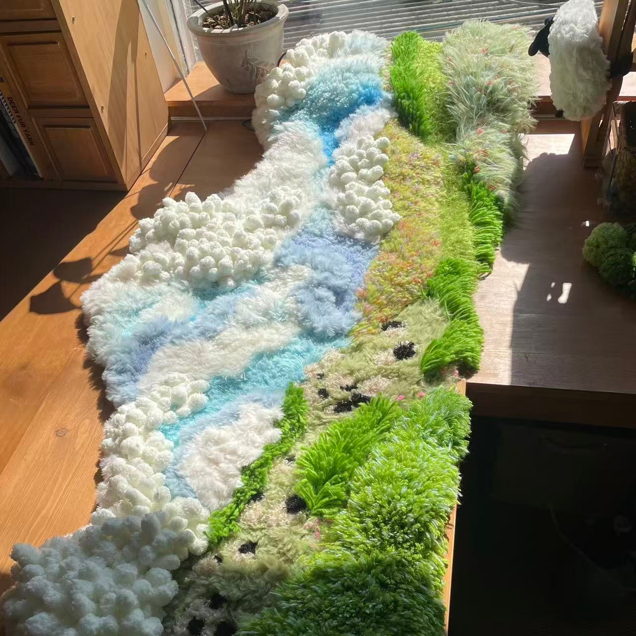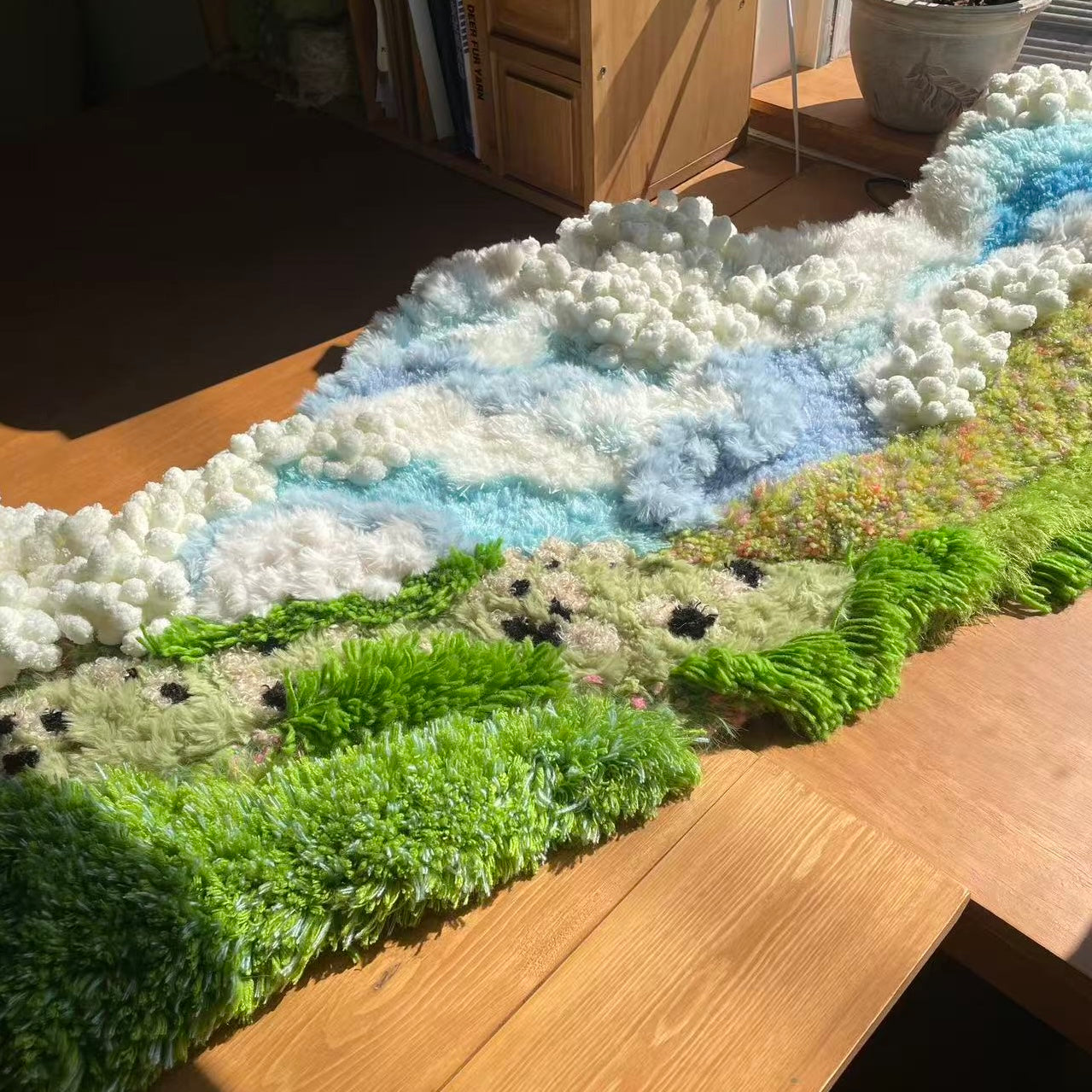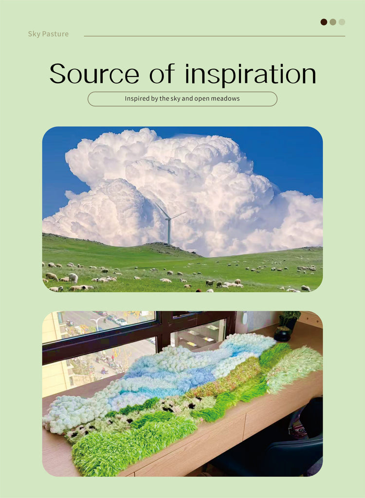Inspired by highland meadows beneath an endless sky, this piece blends layered fibers, soft gradients, and floating textured clusters that evoke clouds gliding over a sunlit pasture.