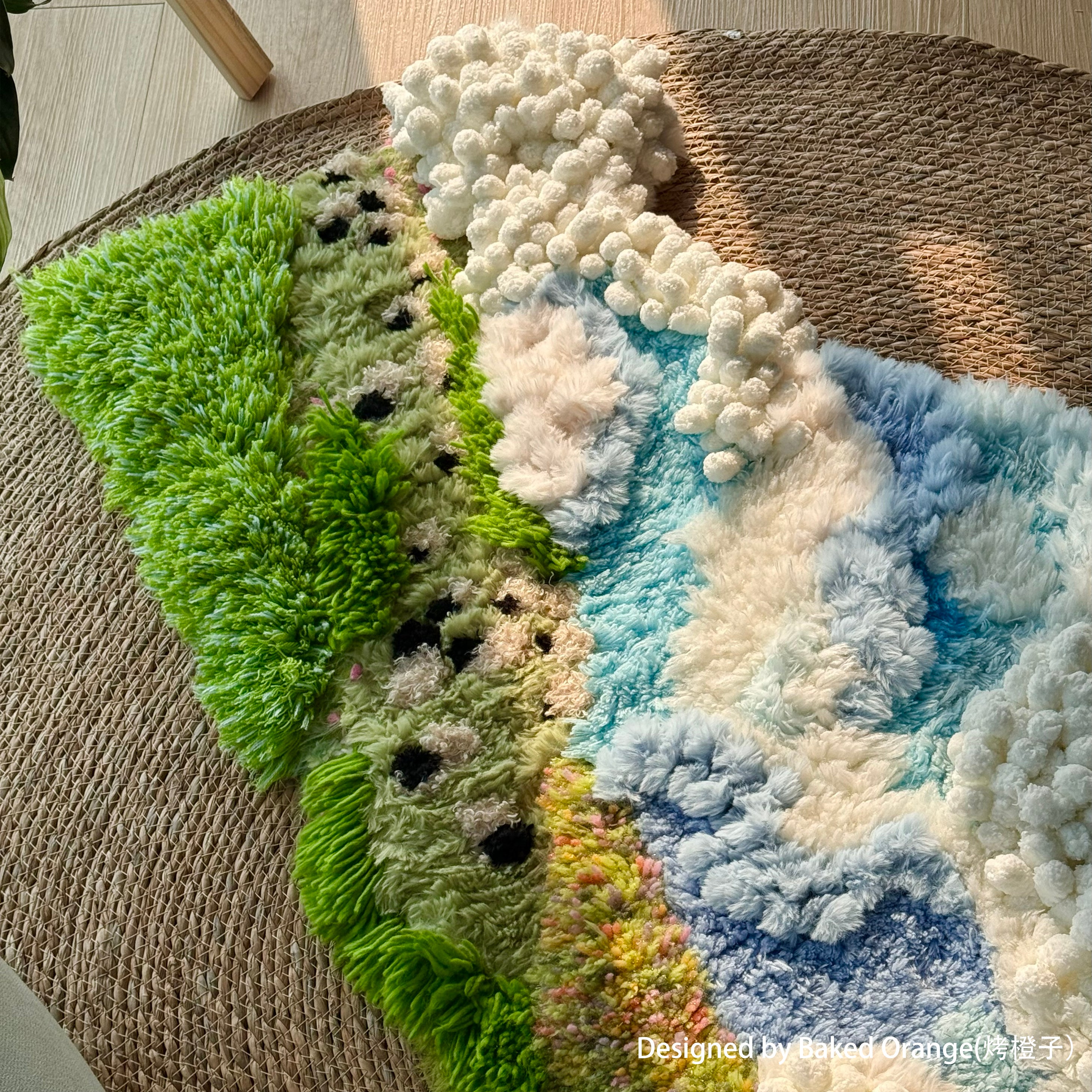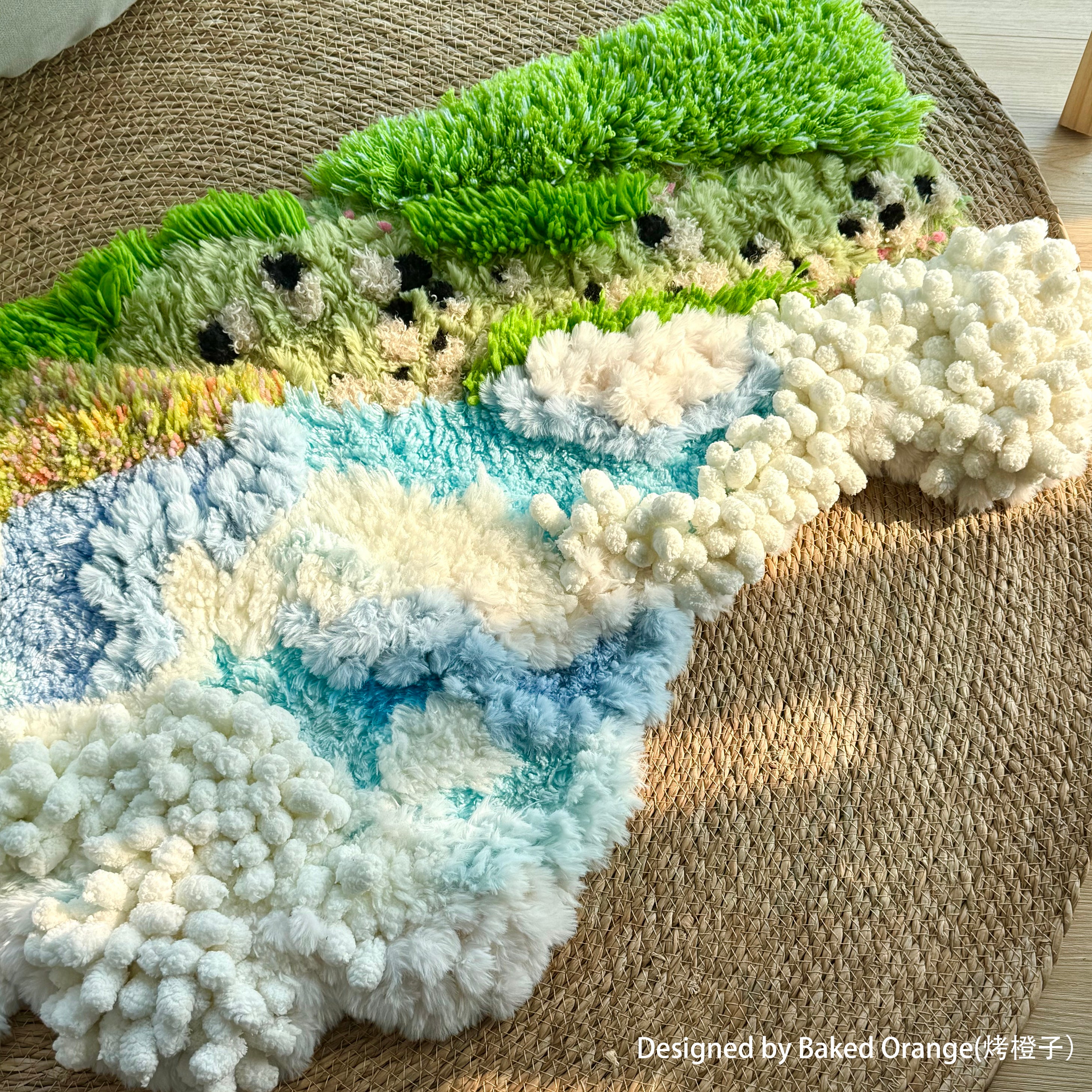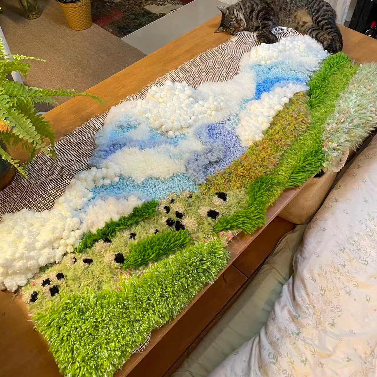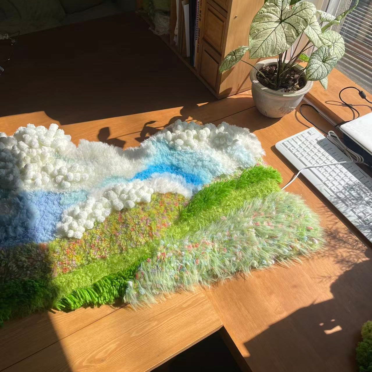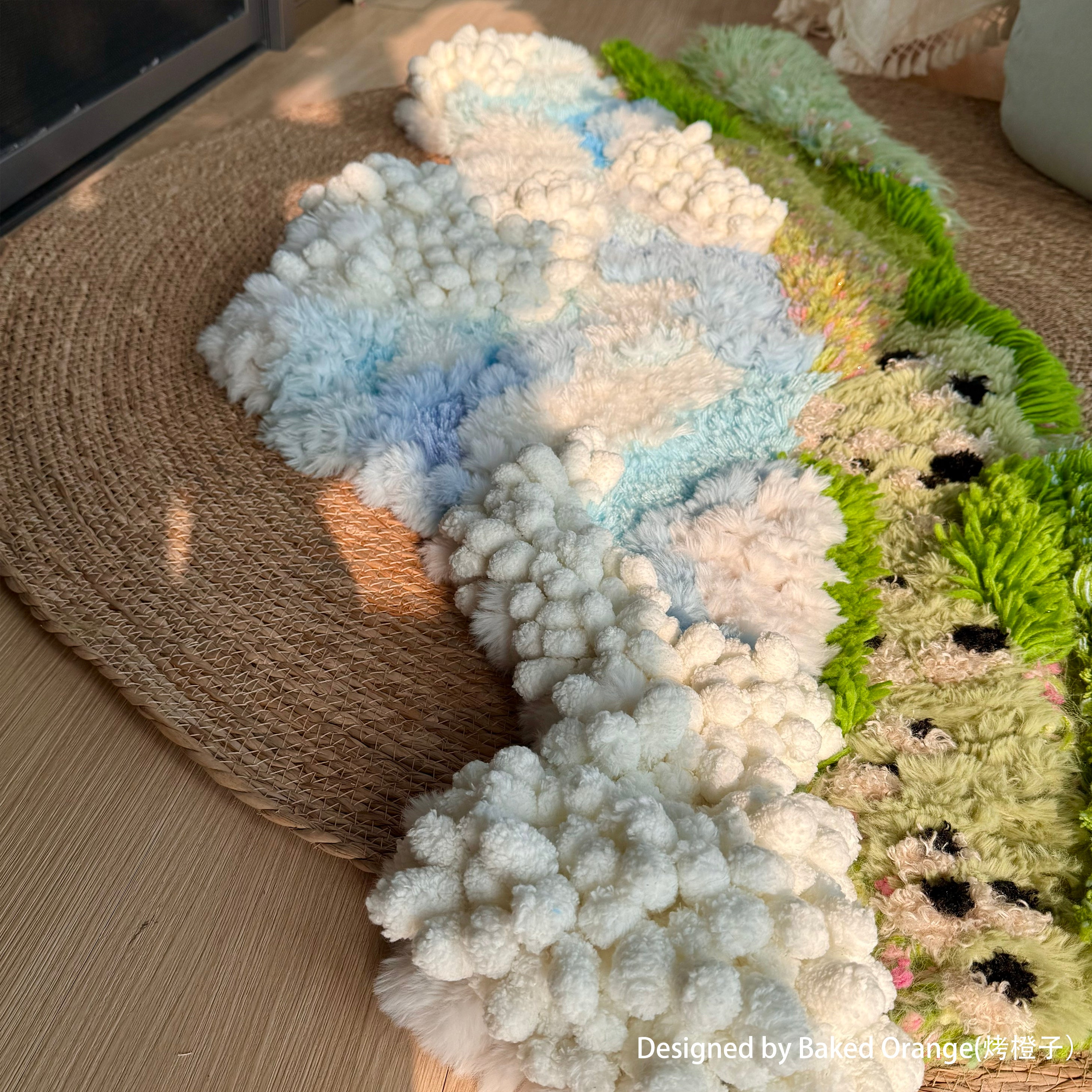 Inspired by highland meadows beneath an endless sky, this piece blends layered fibers, soft gradients, and floating textured clusters that evoke clouds gliding over a sunlit pasture.