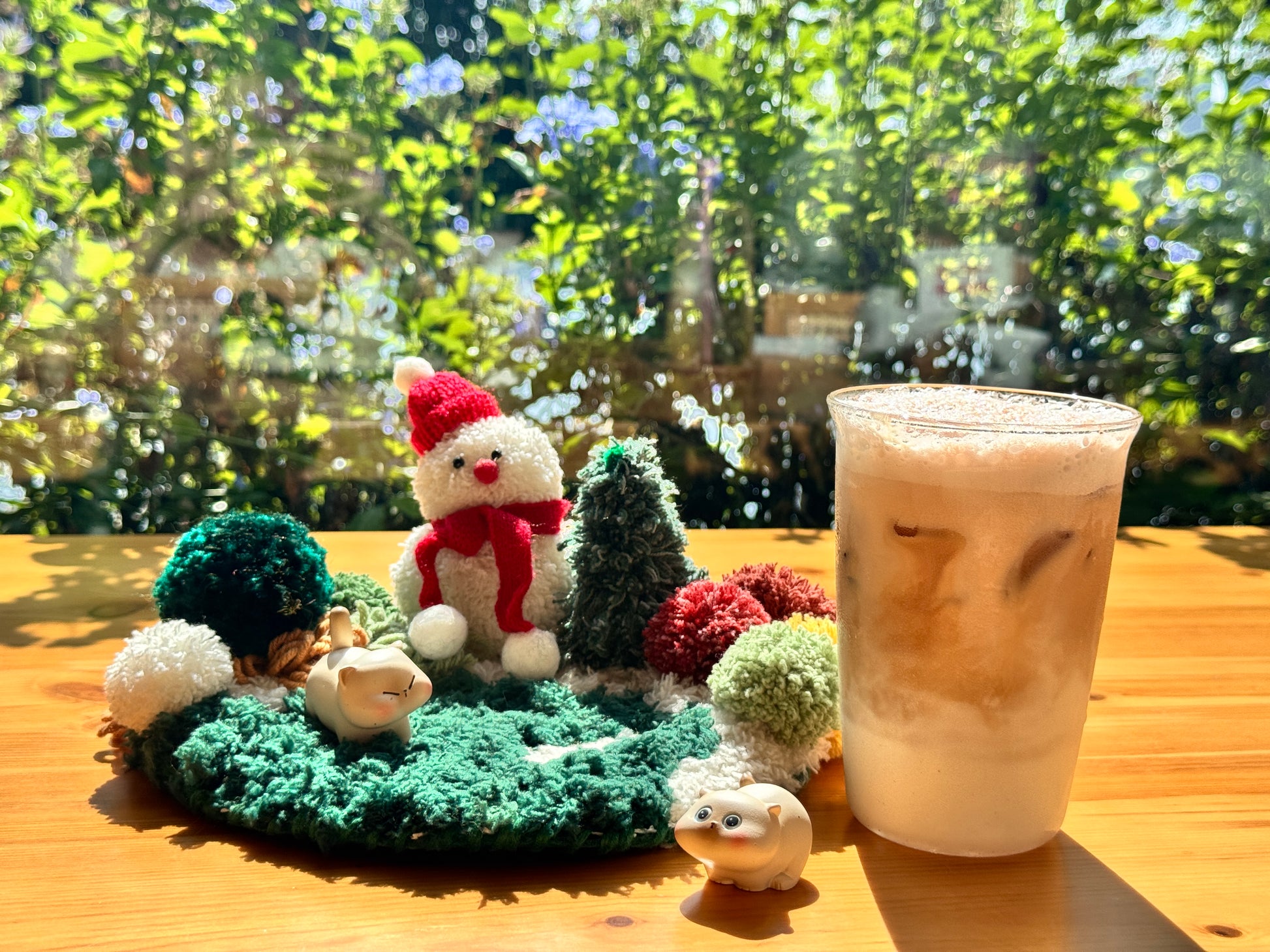 This adorable handmade coaster features a cheerful snowman surrounded by fluffy pom-pom trees and soft snowy textures — a perfect touch of holiday spirit for your home.